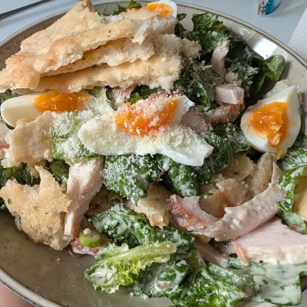 We’re heading away for five weeks soon, which has me in the position of making meals that use up foodstuffs unlikely to last until we return. So this is me walking the walk with a meal we ate over the weekend: Smoked Chicken Caesar Salad.